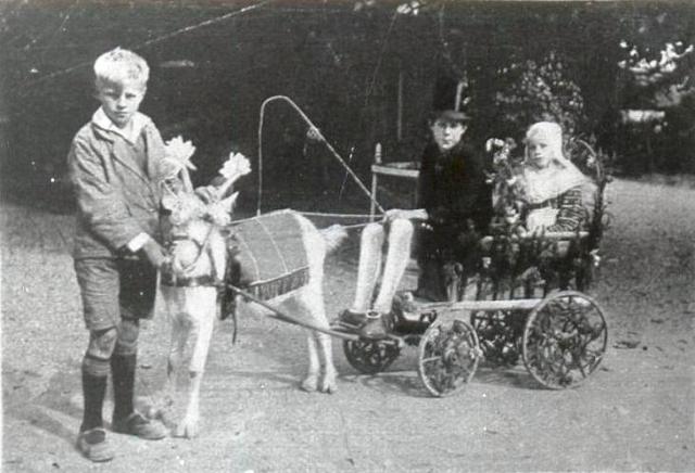 Een aardige groep uit de optocht: Bruid en Bruidegom maken een reisje per versierde bokkenwagen.
